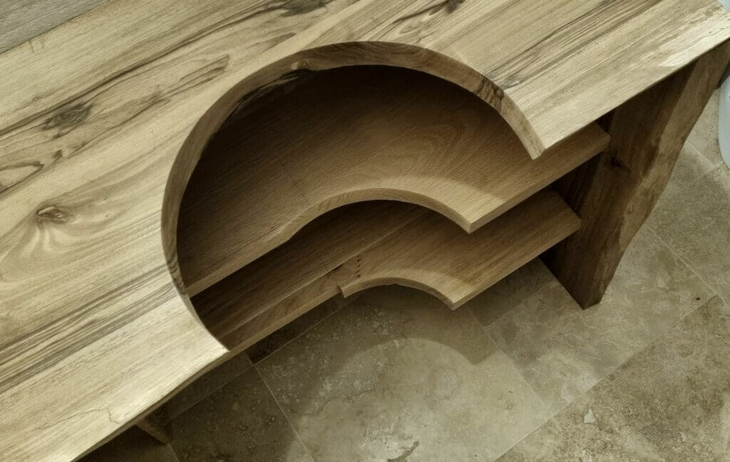 Dans le cas de ce projet, la cliente a eu un gros coup de cœur, il y a quelques années déjà, pour cette vasque conique en granit massif. Son souhait était de l’habiller avec un meuble en noyer massif. Mais pas n’importe quel noyer massif puisqu’il s’agissait de planche que son compagnon avait réussi à débiter d’un arbre abattu il y a de nombreuses années.